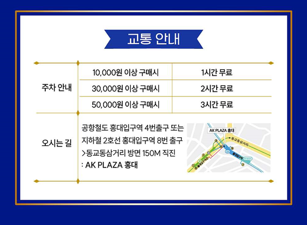 - 결제 금액에 따라 무료 주차 시간 변동 (1~3만원 1시간, 3~5만원 2시간, 5만원 이상 3시간 무료 주차).