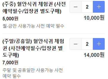 혈안식귀 체험권 가격은 주중 5,000원, 주말 7,000원으로 주말에 약간 높은 티켓 가격이 적용됩니다.
